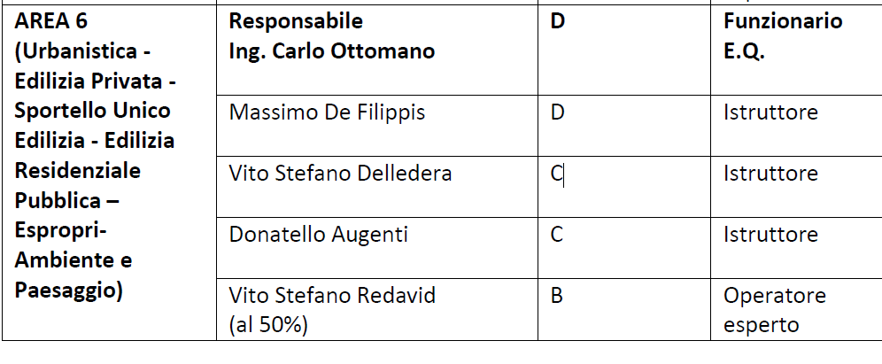 Organigramma Area 6 (Urbanistica, Edilizia Privata, Sportello Unico Edilizia, Edilizia Residenziale Pubblica, Espropri, Ambiente e Paesaggio)