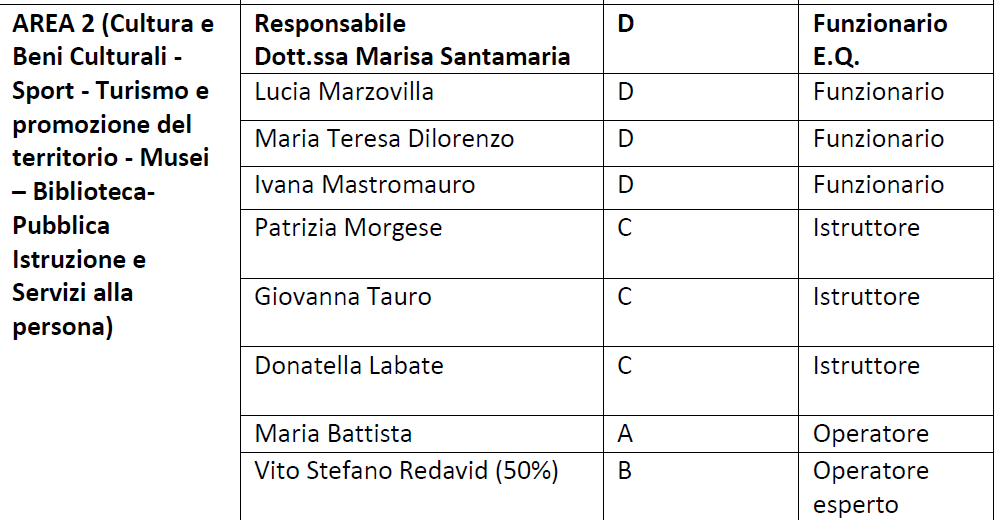| Oggetto | AREA 2 (Cultura e Beni Culturali - Sport - Turismo e promozione del territorio - Musei – Biblioteca- Pubblica Istruzione e Servizi alla persona) |