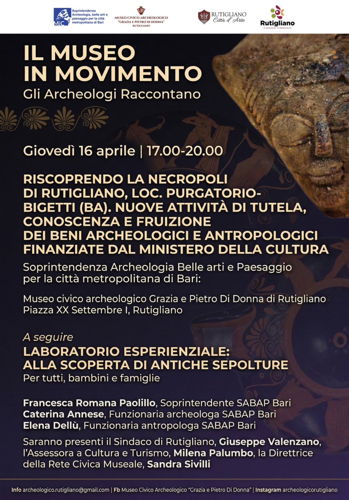 L’evento consisterà nella presentazione da parte della Soprintendenza ABAP per la Città metropolitana di Bari delle nuove indagini archeologiche e antropologiche in corso sulla necropoli, datata tra VII e III secolo a.C. e contraddistinta da sepolture maschili e femminili di rango, che è stata scoperta negli anni ’70 del secolo scorso a Rutigliano (BA); l’intervento sarà curato dal Soprintendente Francesca Romana Paolillo, della funzionaria archeologa Caterina Annese, della funzionaria antropologa Elena Dellù, e si concluderà con un laboratorio aperto a tutti, in cui il pubblico, con particolare attenzione a bambini e famiglie, potrà fare esperienza dei materiali e dei metodi della ricerca archeologica.